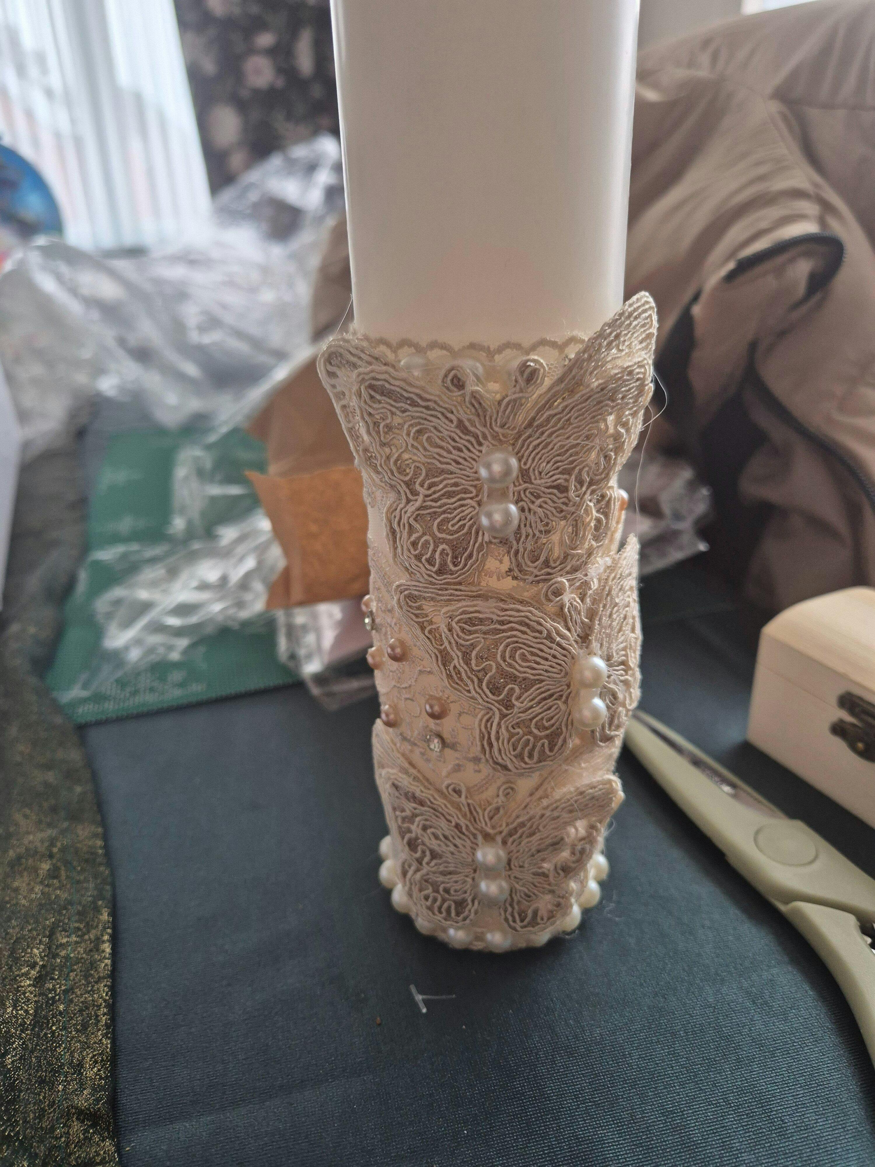 • Lumanarea pentru botez, decorata cu fluturasi si numeroase perlute.