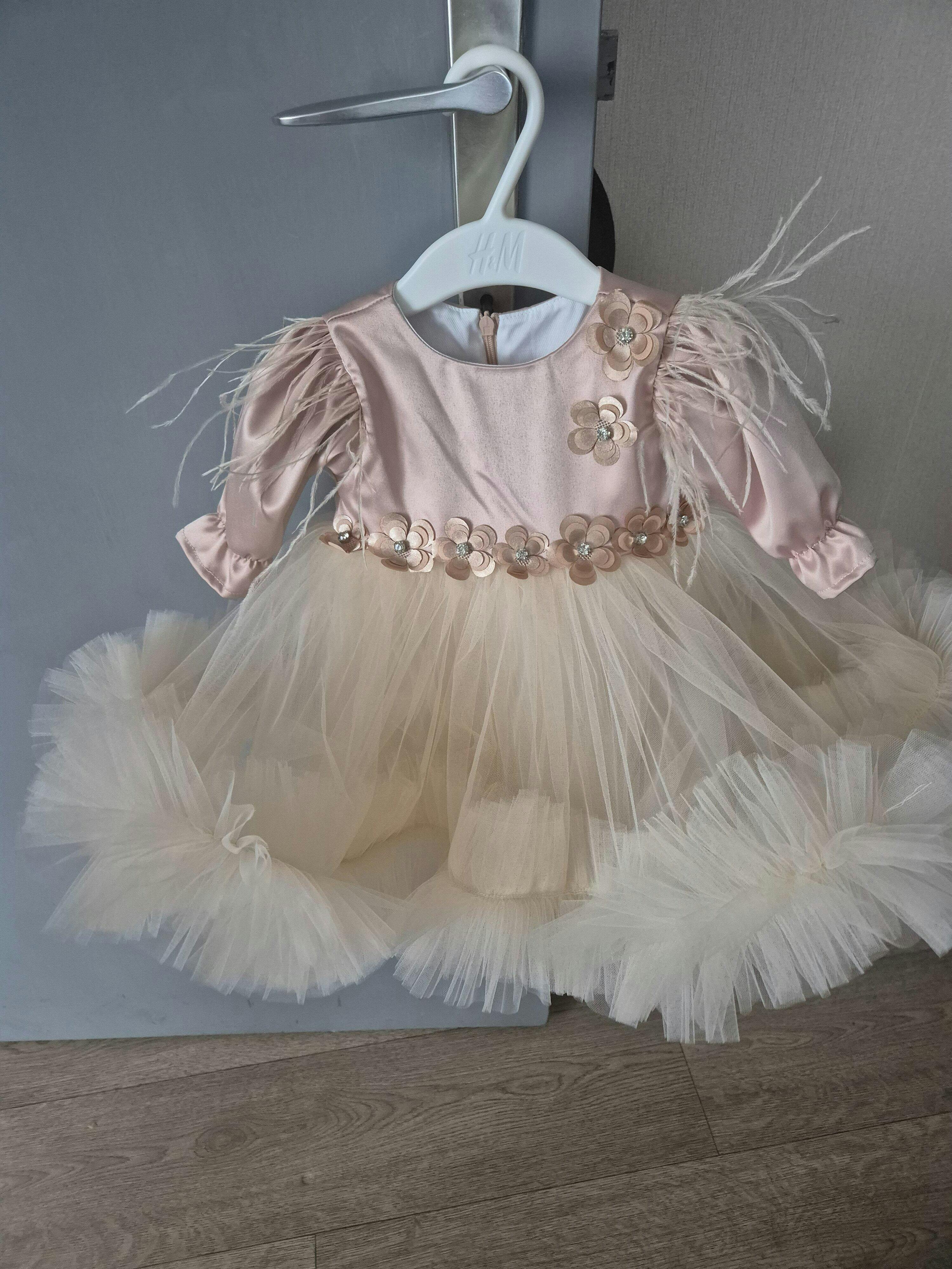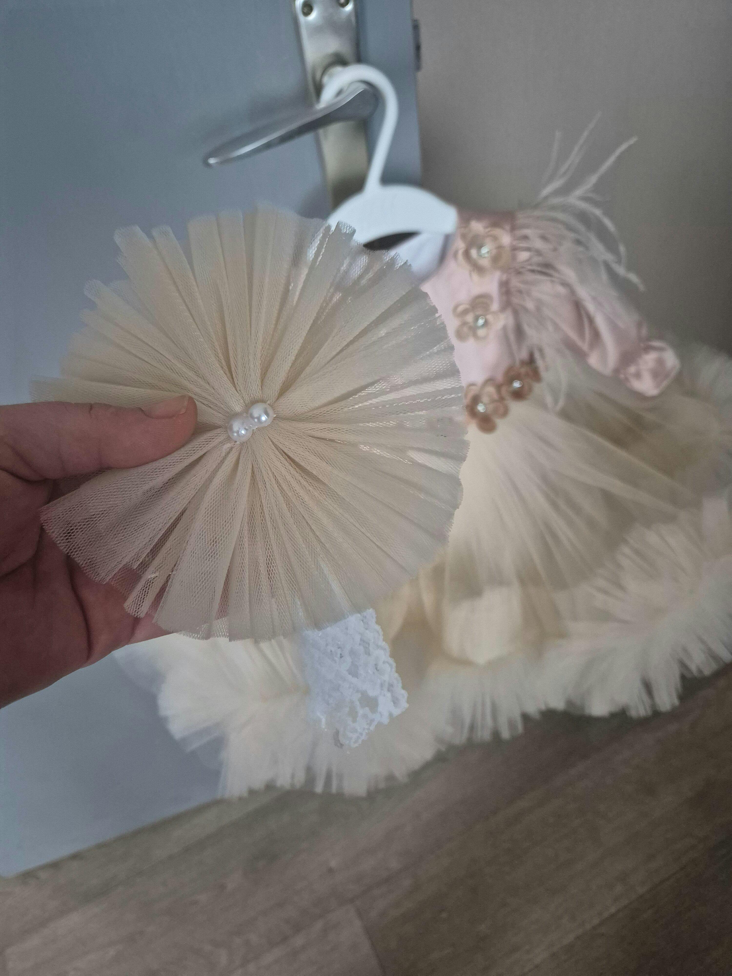 • Rochita crem – partea superioara a rochiei este realizata din tafta, conferindu-i un aspect sofisticat si rafinat. Fusta sa ampla este creata din tul, aducand un aer diafan si elegant intregii tinute. Manecile lungi sunt decorate cu pene aplicate.