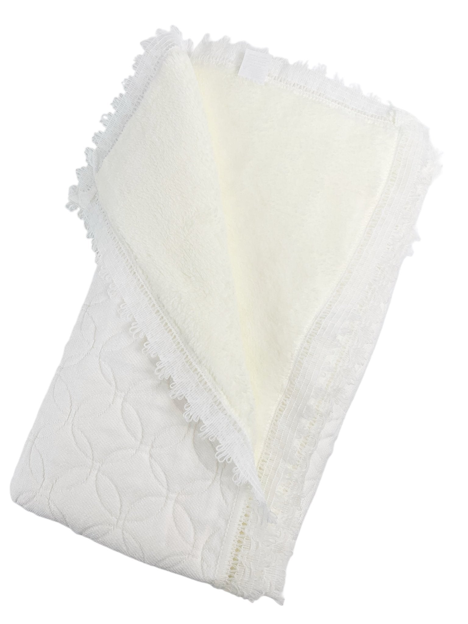 Exteriorul are un model adorabil cu cerculete si franjuri, iar interiorul este captusit cu puf moale si calduros, perfect pentru pielea delicata a bebelusilor.