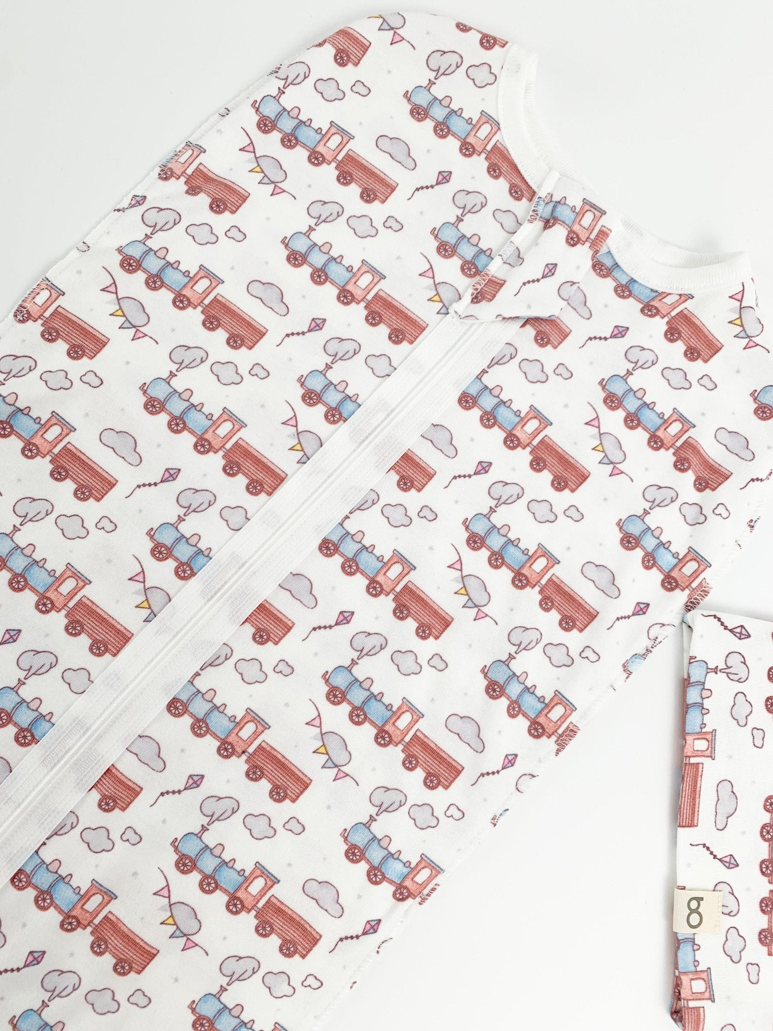 Sac de dormit bebe 2 piese - alb cu trenulet