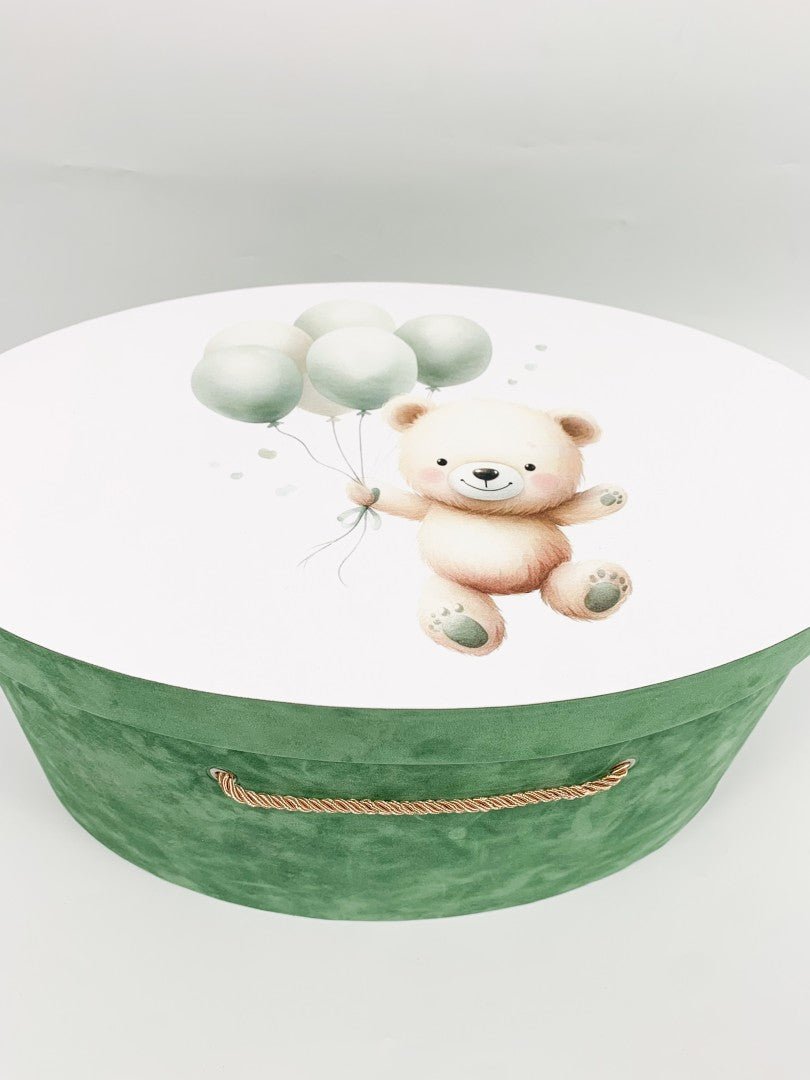 - Invelit in catifea si avand o nuanta delicata de verde, cufarul este personalizat cu un ursulet adorabil, aducand un plus de caldura si tandrete.