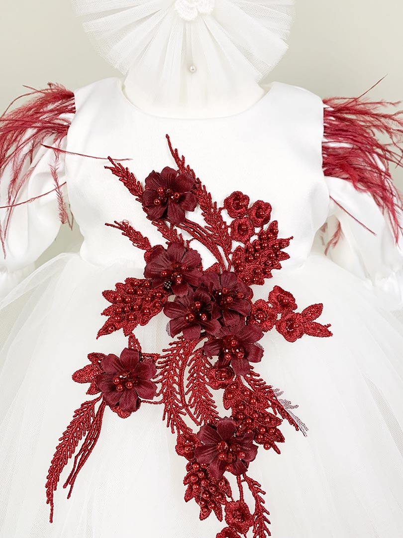 - Rochita - o adevarata bijuterie. Alb pur si imaculat, acesta nuanta simbolizeaza puritatea si inocenta, iar aplicatiile sofisticate din dantela brodata si perlute adauga o nota subtila de culoare si eleganta. Manecile lungi cu pasmanterie aplicata confera tinutei un aer regal si distins.