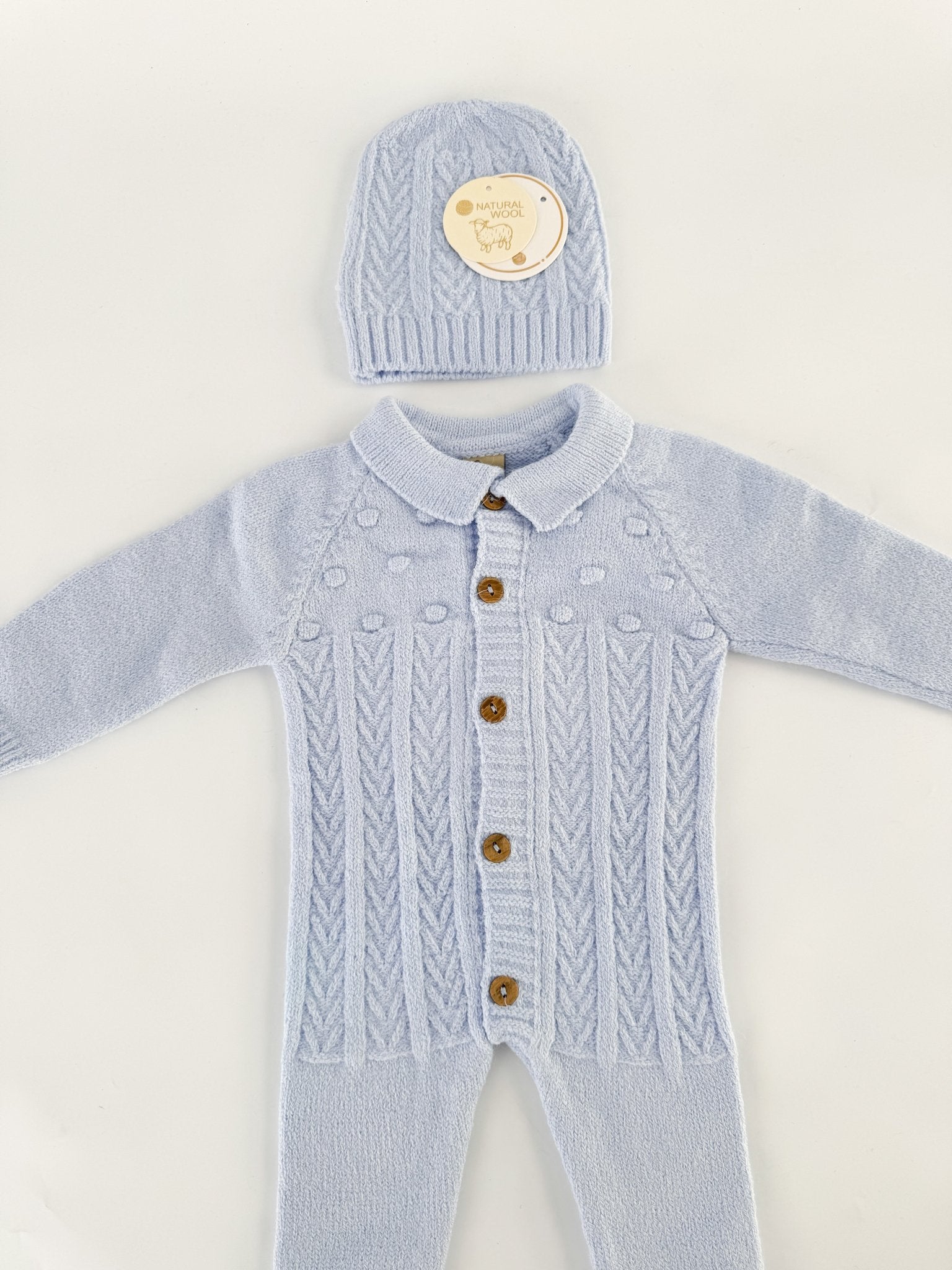 Aceasta salopeta albastra din lana cu model tricotat este alegerea perfecta pentru zilele racoroase, oferind micutului dumneavoastra caldura si confort.
