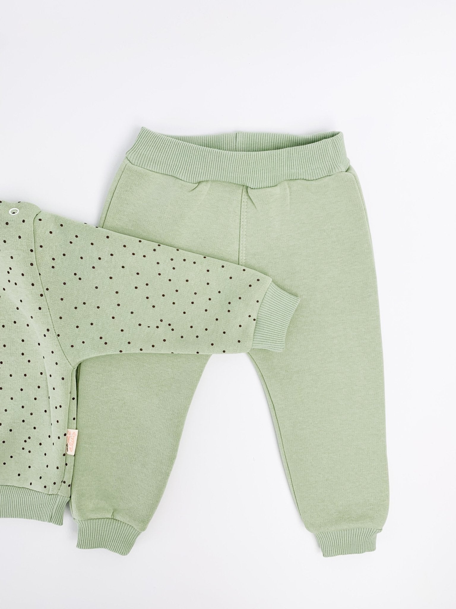 Bluzita verde cu maneci lungi este realizata dintr-un material gros, avand mansete elastice ce asigura o fixare stabila.