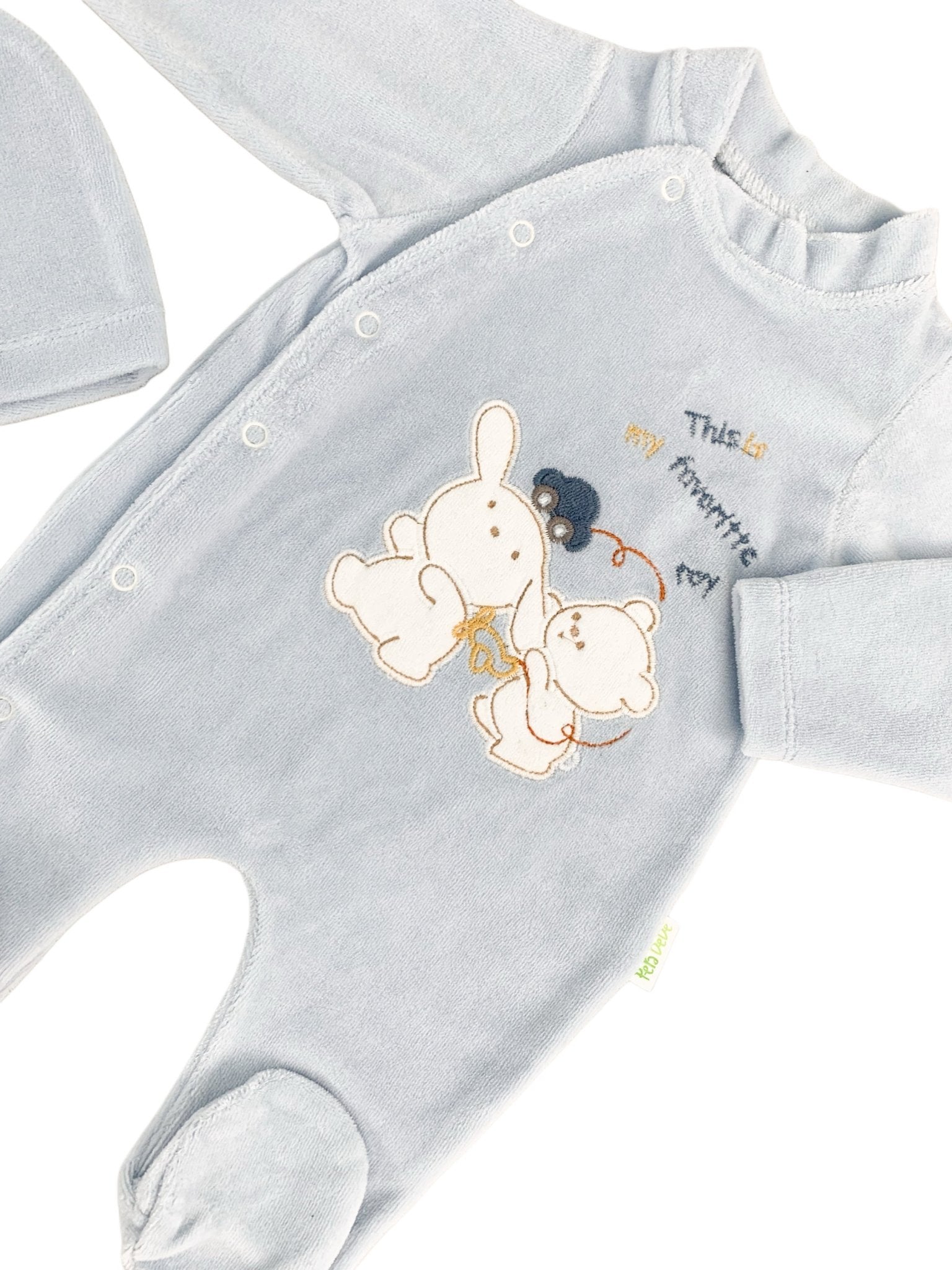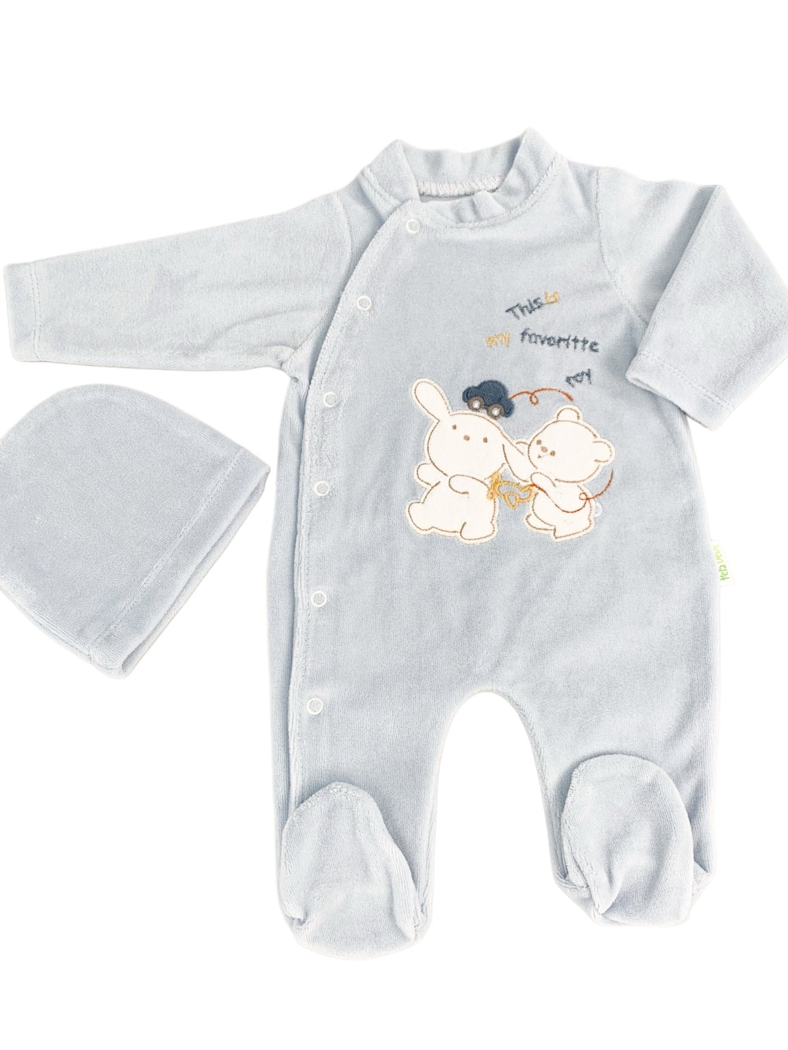 Salopeta albastra pufoasa baiat cu ursulet si iepuras