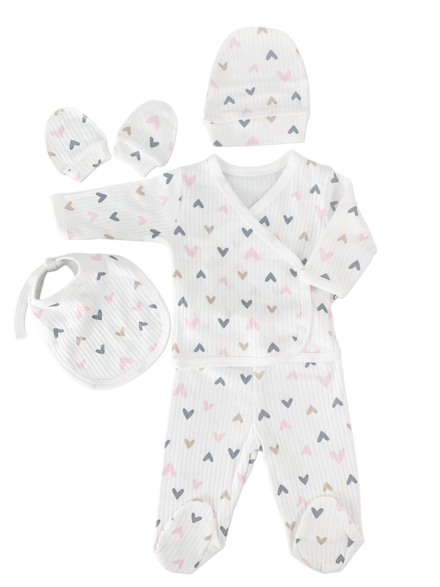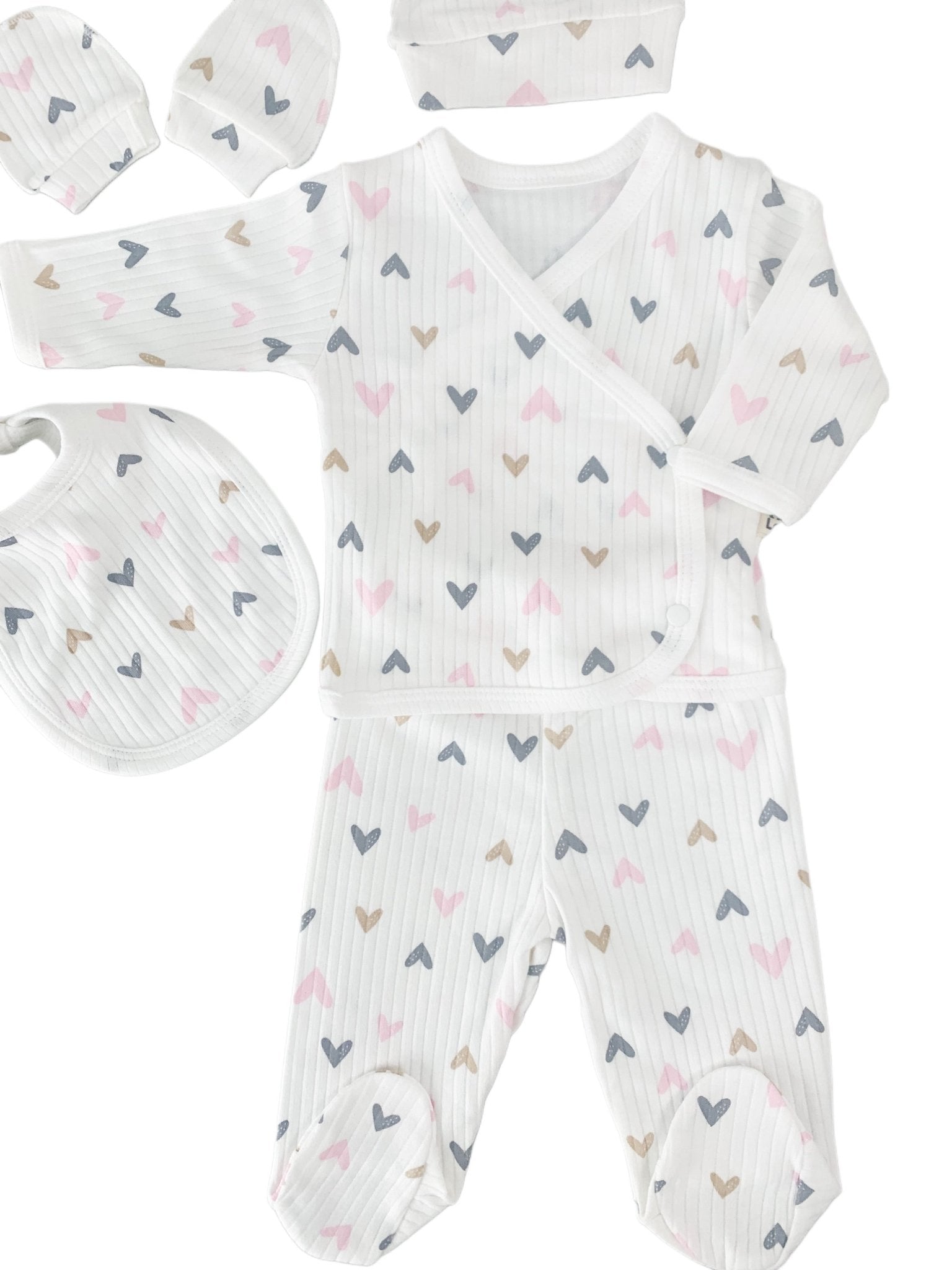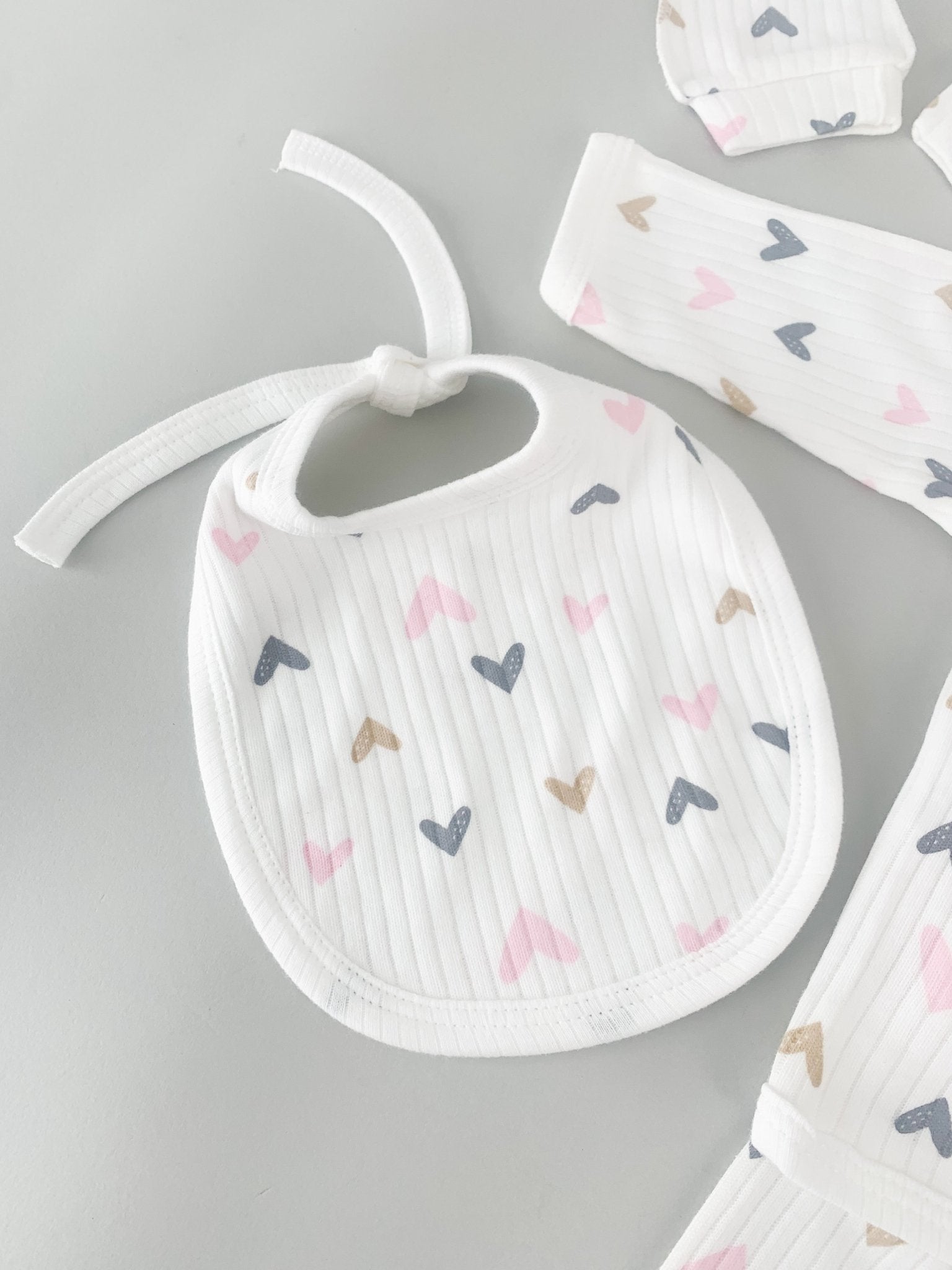 Salopeta fetite alba cu inimioare - 5 piese - Botez bebelusi