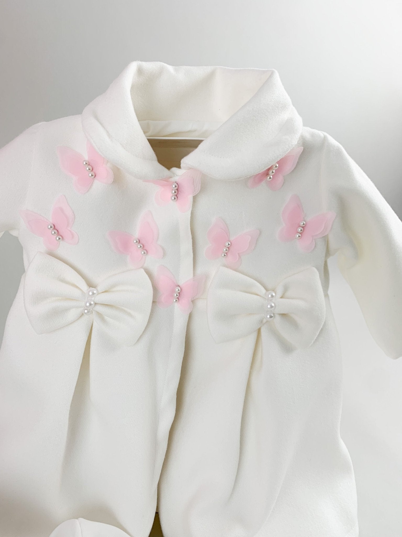 ✔ Paltonas alb gros si vatuit – Realizat din material pufos si calduros, cu guler rotund si mare, ideal pentru sezonul rece. Fluturasii aplicati manual adauga o nota de eleganta.