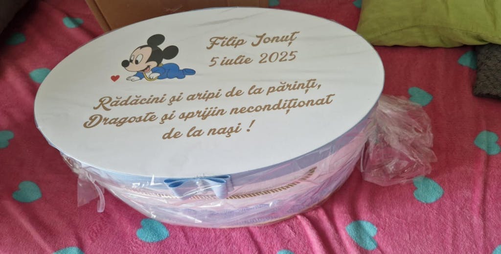 Trusoul este ambalat intr-o cutie mare si incapatoare personalizata cu un mesaj emotionant.