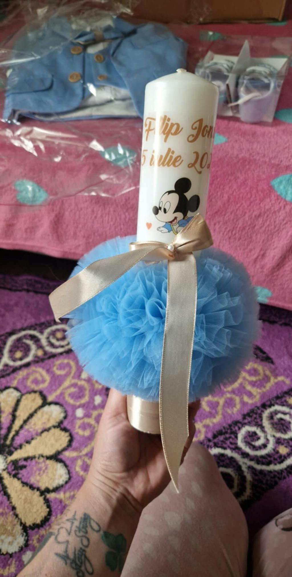 - Lumanare confectionata din ceara de cea mai buna calitate. Este decorata cu tul si fundita satinata pentru un plus de eleganta si este personalizata cu personajul “Mickey Mouse”, numele si data nasterii insa personalizarea poate fi facuta in functie de preferinte.